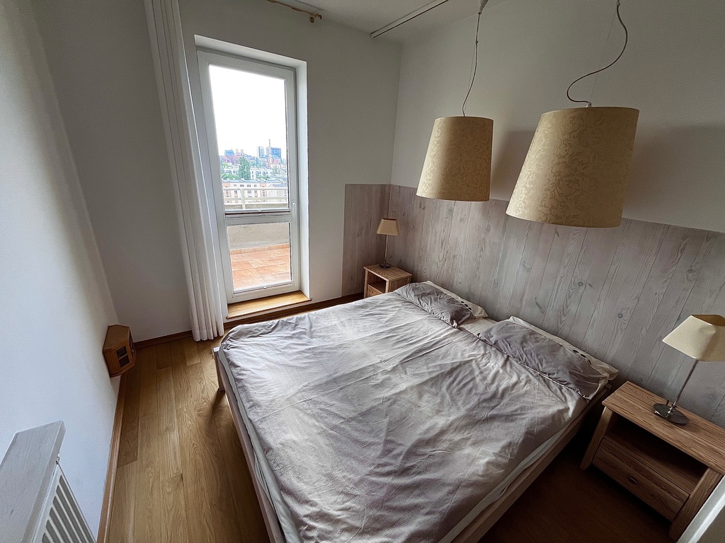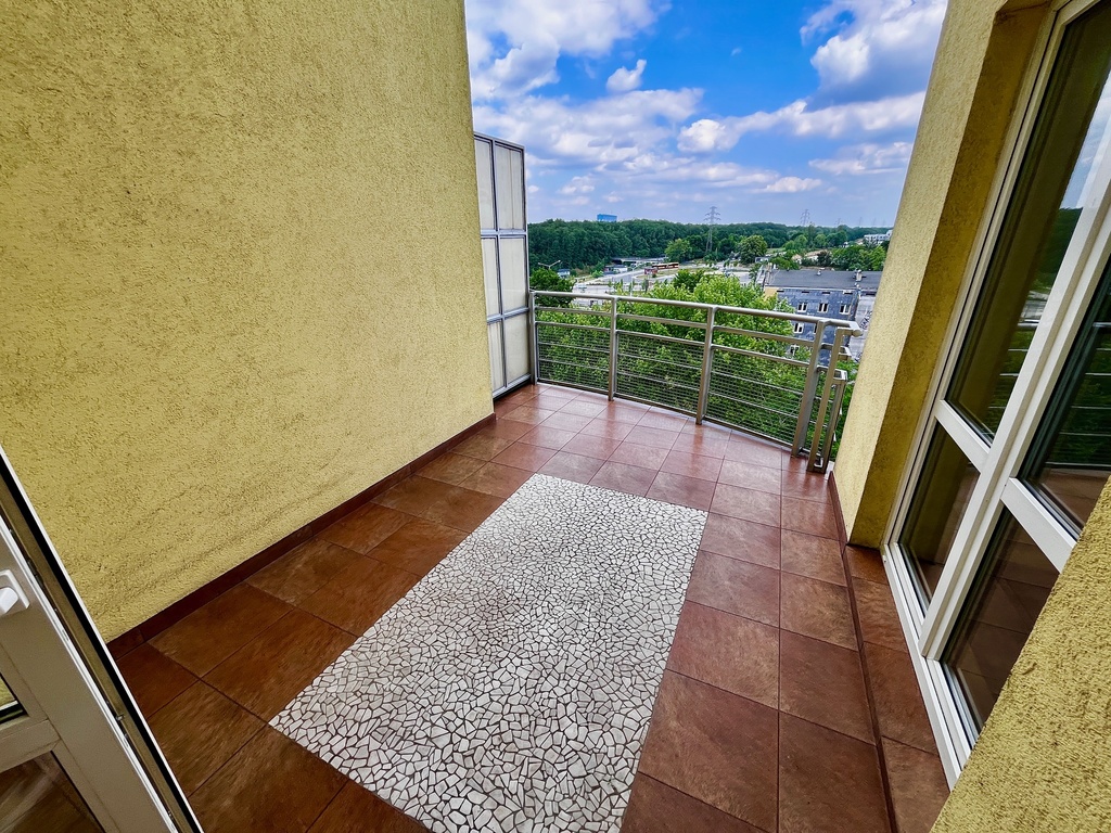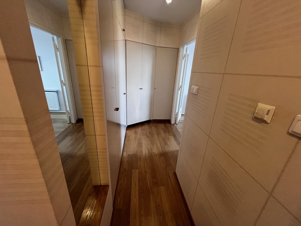 Mieszkanie w stanie bardzo dobrym rozkładowe i składa się z salonu z aneksem kuchennym i wyjściem na duży taras od strony zachodniej ,stylowego gabinetu z którego jest wyjście na taras skierowany na stronę wschodnią , korytarza osobnej łazienki z oknem oraz obszernej sypialni z wyjściem na taras skierowany na zachodnią stronę .
