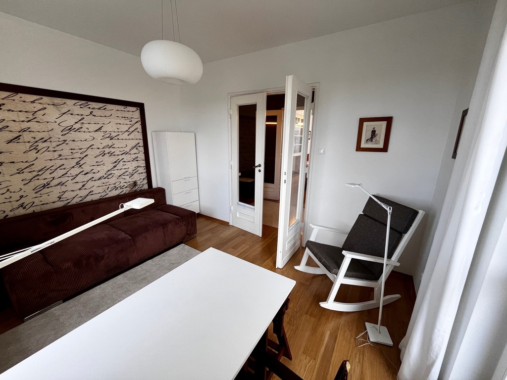 Mieszkanie w stanie bardzo dobrym rozkładowe i składa się z salonu z aneksem kuchennym i wyjściem na duży taras od strony zachodniej ,stylowego gabinetu z którego jest wyjście na taras skierowany na stronę wschodnią , korytarza osobnej łazienki z oknem oraz obszernej sypialni z wyjściem na taras skierowany na zachodnią stronę .