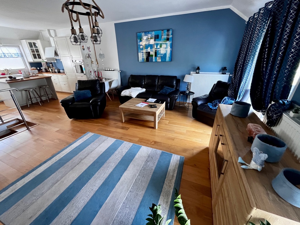 Salon z oknami panoramicznymi na stronę południowo zachodnią z dużym tarasem z widokiem na zachody Słońca oraz otwarta kuchnia z wyspą na stronę wschodnią ( z zapleczem i tzw. miejscem na pralkę).
