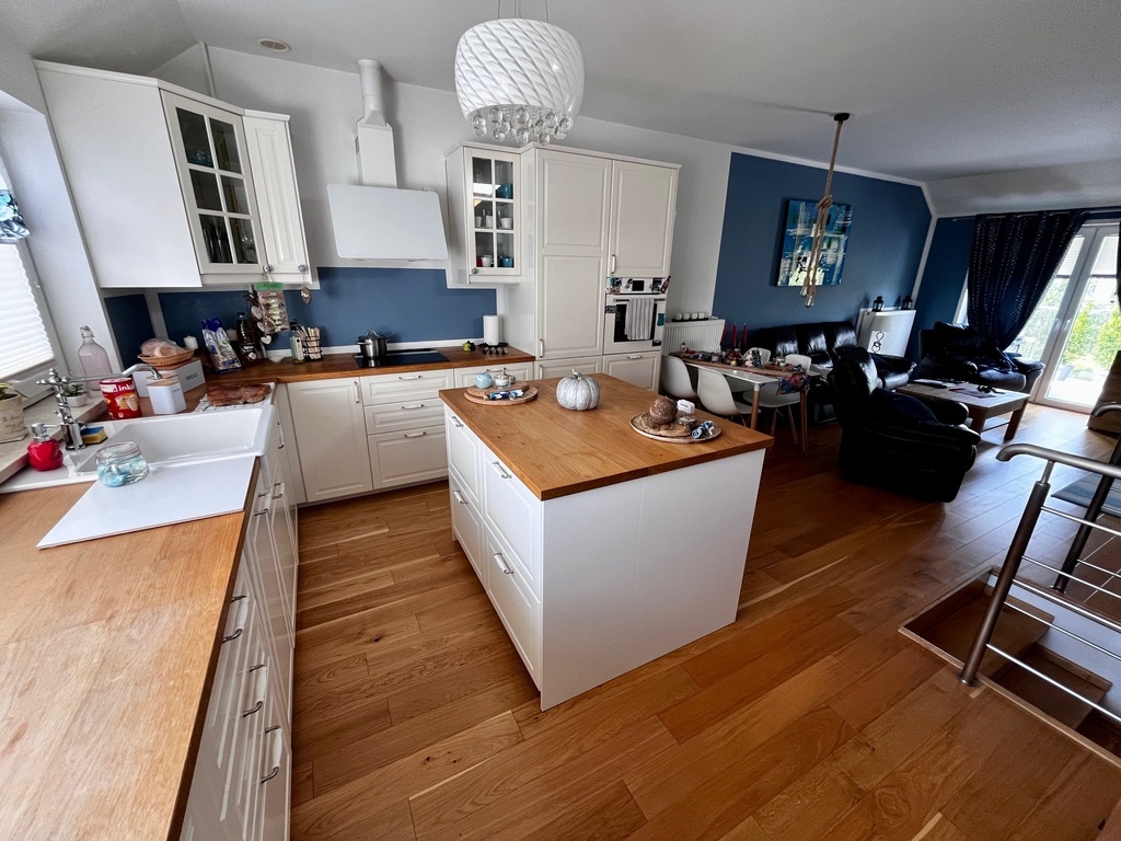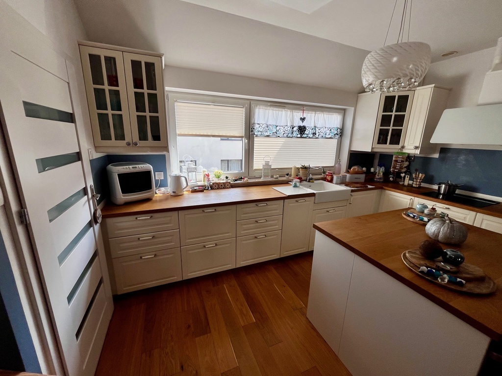 Salon z oknami panoramicznymi na stronę południowo zachodnią z dużym tarasem z widokiem na zachody Słońca oraz otwarta kuchnia z wyspą na stronę wschodnią ( z zapleczem i tzw. miejscem na pralkę).