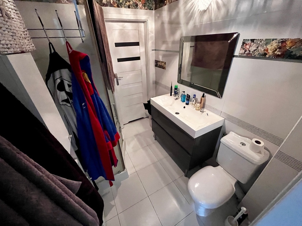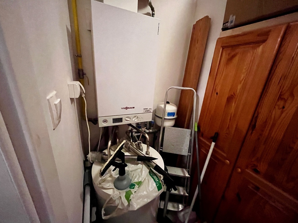 Łazienka z prysznicem i zapleczem, gdzie znajduje się kotłownia z piecem dwu funkcyjnym Viessman ( służy do podgrzewania wody i grzejników we wszystkich pokojach).