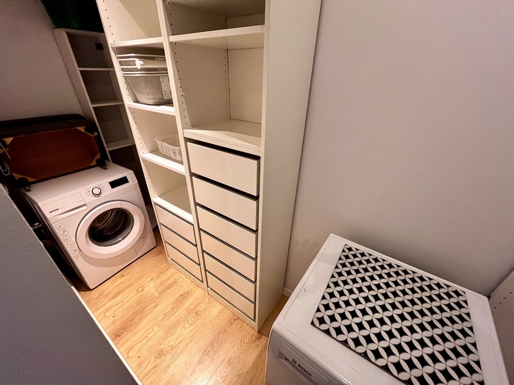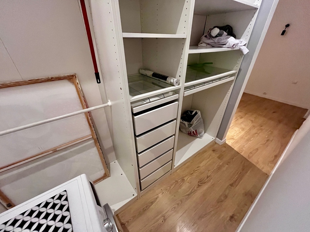 - obecnie mieszkanie posiada jedną sypialnię, połączoną z funkcjonalną garderobą (zabudowa, pralka i suszarka) oraz z przytulnym gabinetem. Istnieje możliwość łatwego wydzielenia drugiej sypialni.