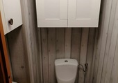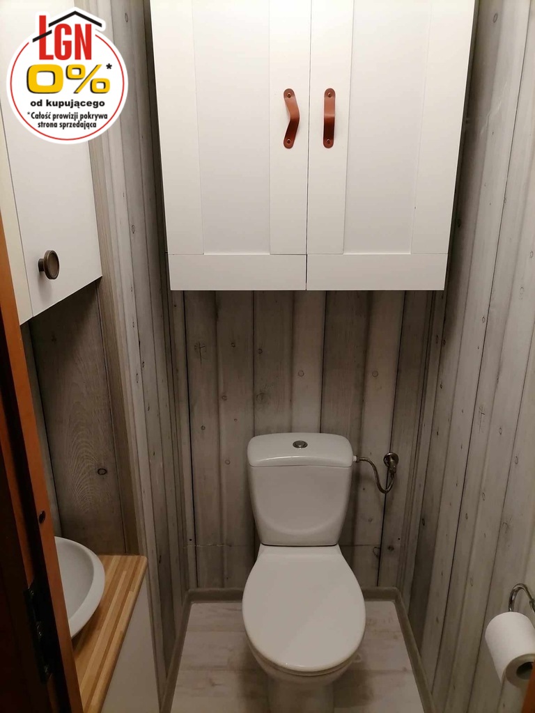 *osobna toaleta wyposażona w umywalkę i dwie szafki.