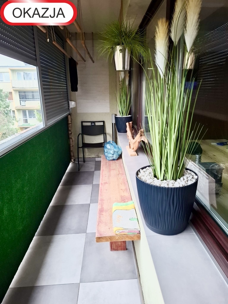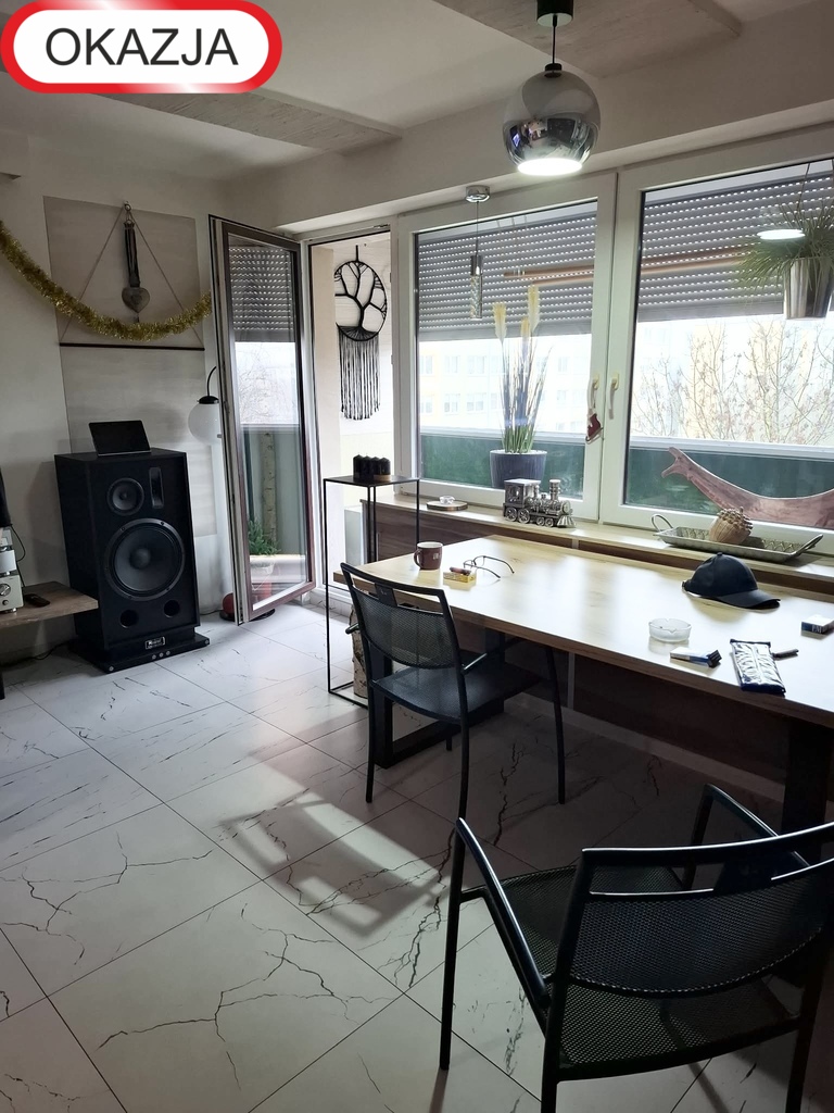 W pokoju dziennym na podłodze terakota, ściany gładzone pomalowane, wyjście na przestronny balkon loggia ( zabudowany)