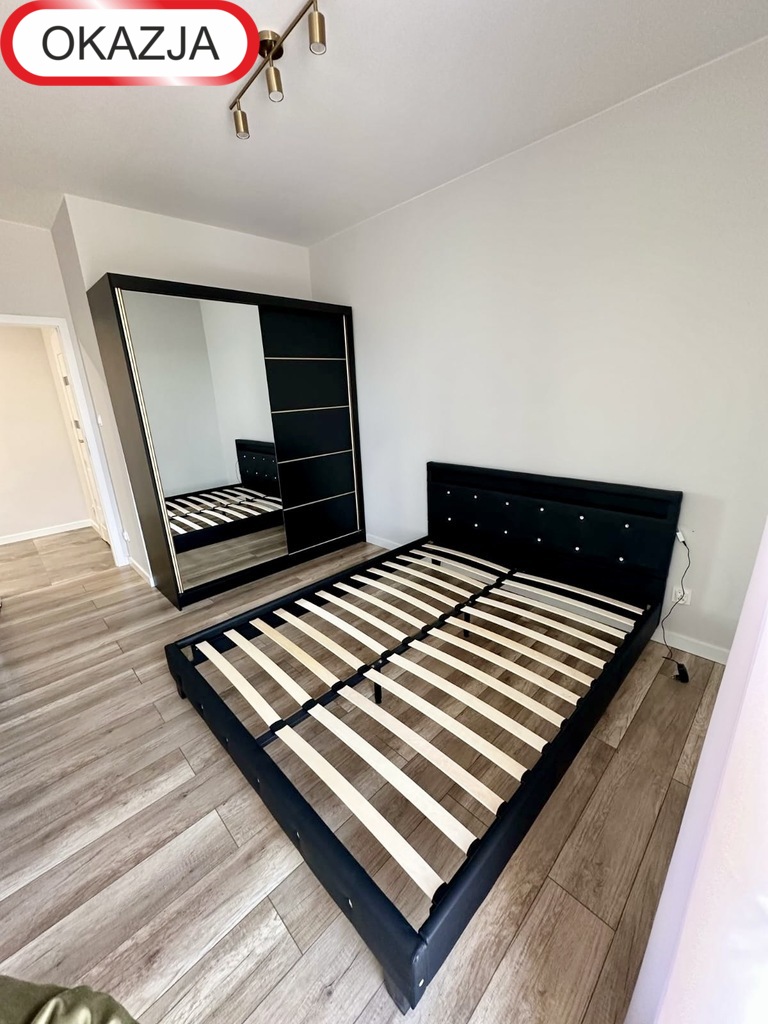 Sypialnia jest wyposażona w duże łóżko z oświetleniem LED i wielka szafa.