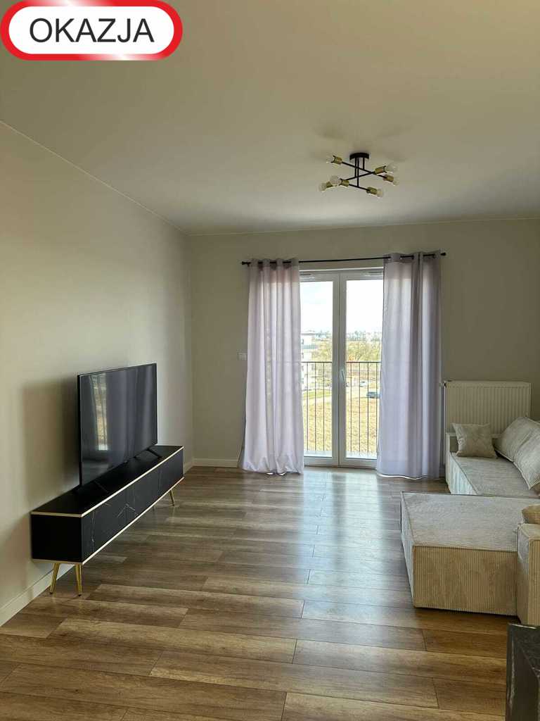 Salon wyposażony jest w stół i 4 krzesła, wygodną kanapę i szafkę RTV z otworem dla kabli.