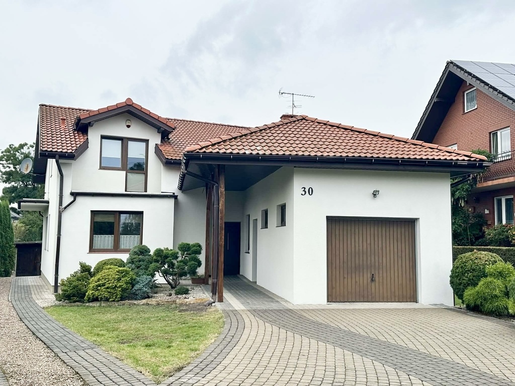 Podjazd wyłożony jest kostką brukową z miejscami parkingowymi przed garażem jak i przed bramą.