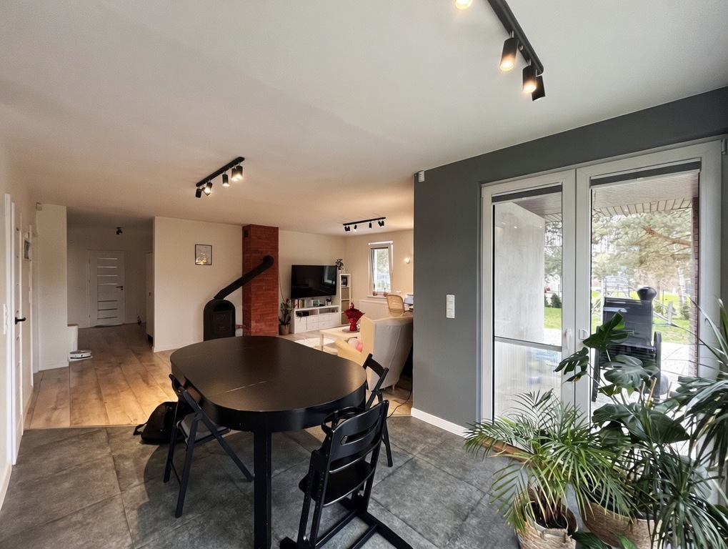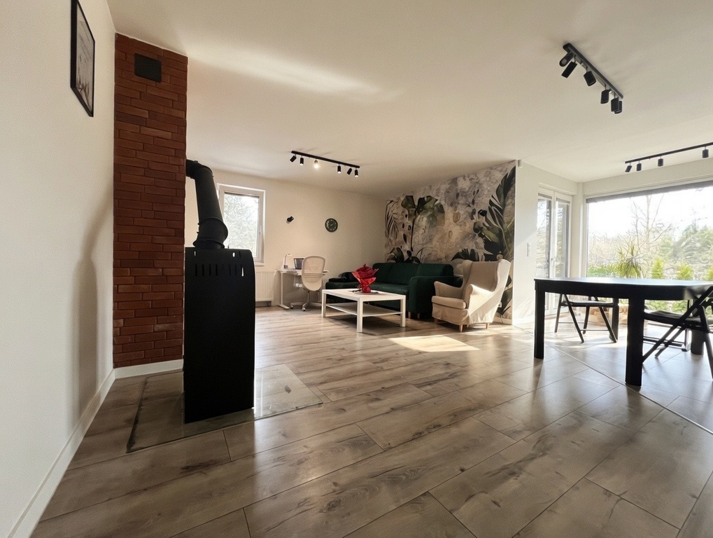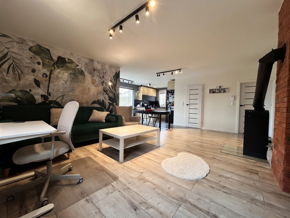 W środku stylowy kominek, solidne okna trzyszybowe, dobrej jakości podłogi panele i płytki PCV.
